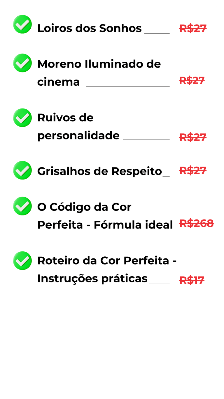 Pensando nisso, criei este material com uma curadoria visual completa: mais de 70 referências reais de coloração (loiro, moreno iluminado, ruivo e grisalho), inspirações de fórmulas prontas e instruções práticas de aplicação e manutenção da cor.